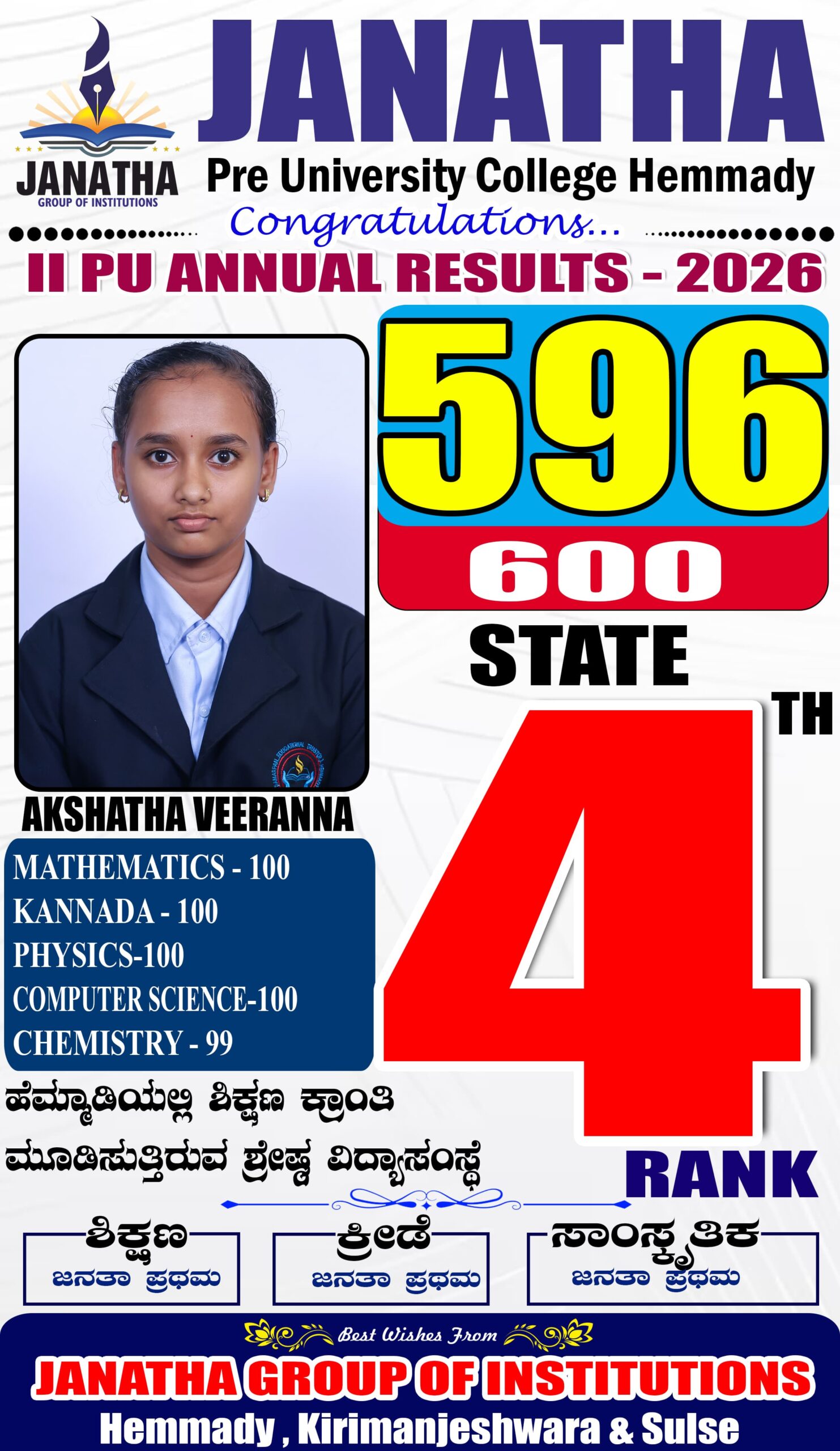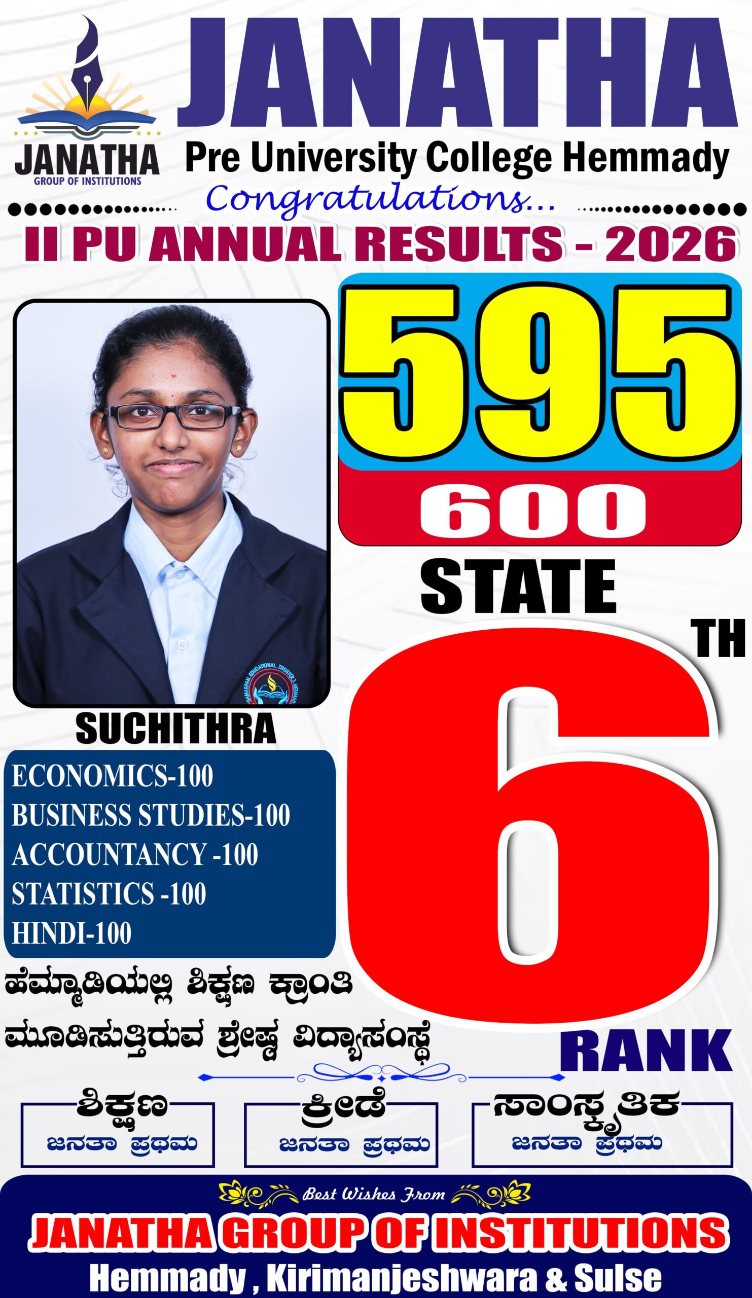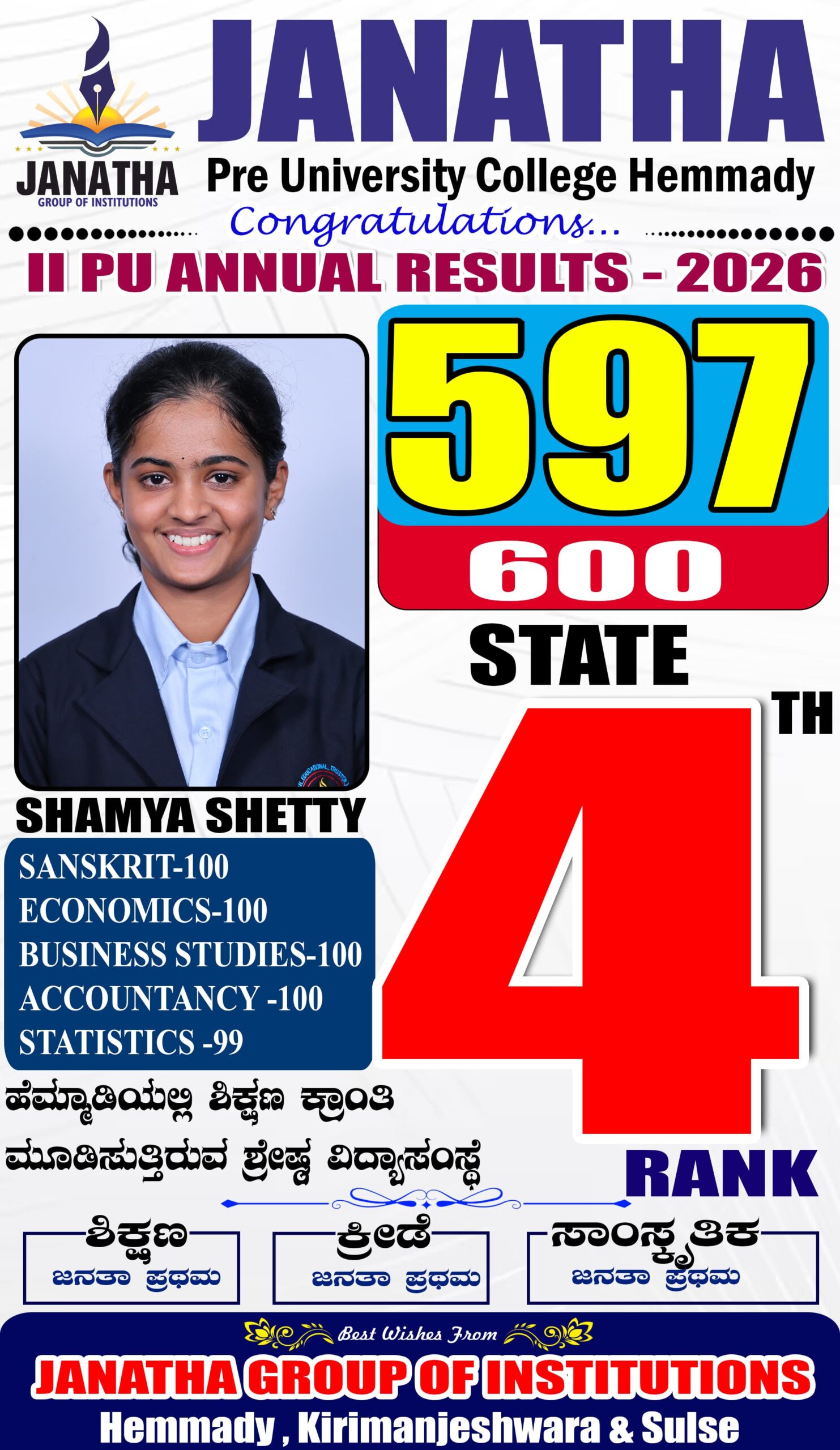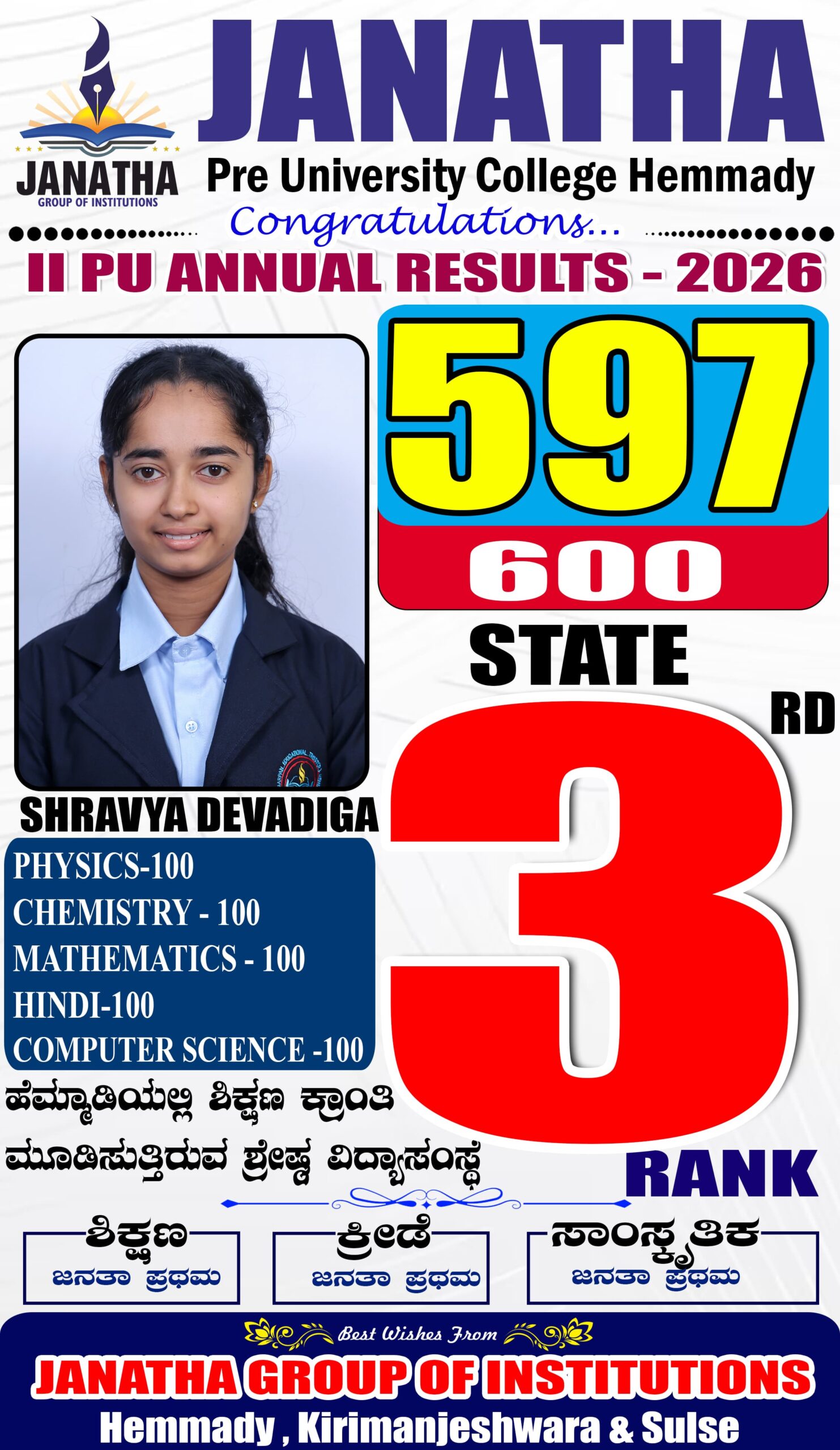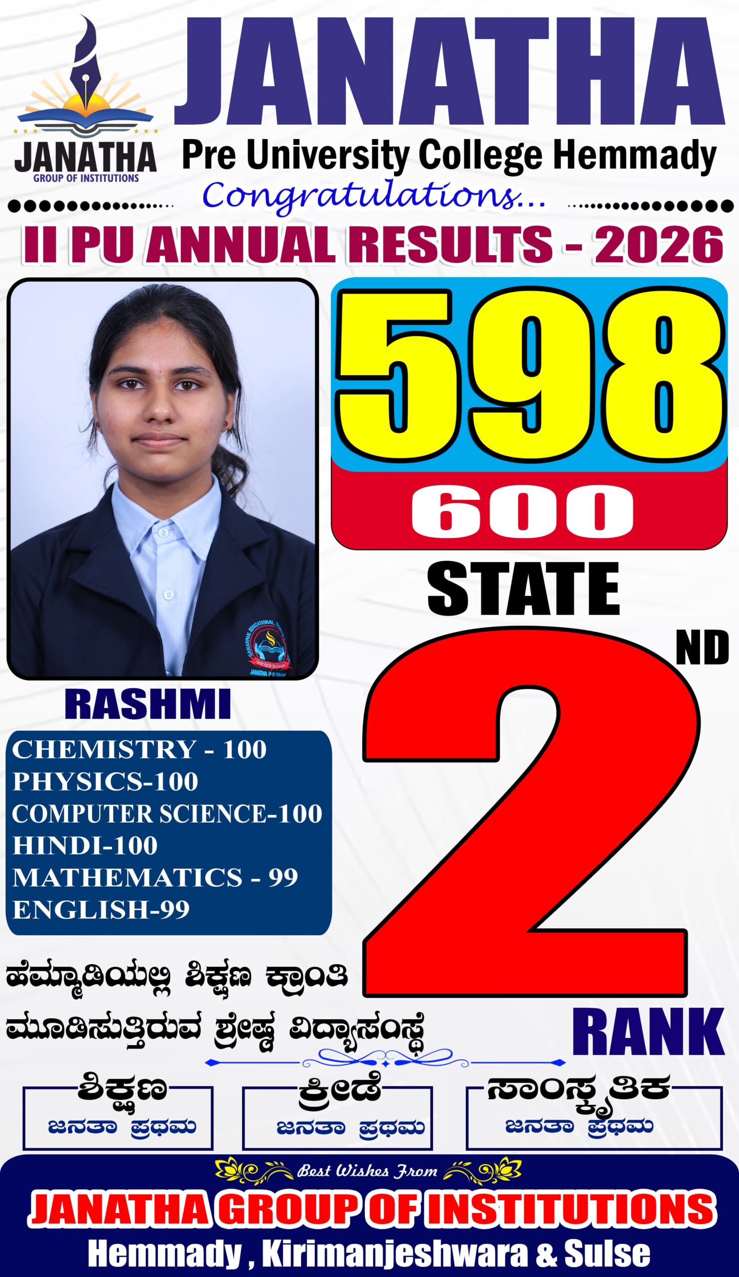 ಕುಂದಾಪುರ: ಉಡುಪಿ ಜಿಲ್ಲೆಯಲ್ಲಿ ಶಿಕ್ಷಣ ಕ್ರಾಂತಿಯನ್ನೇ ಉಂಟು ಮಾಡಿರುವ ಕುಂದಾಪುರದ ಹೆಮ್ಮಾಡಿಯ ಜನತಾ ಶಿಕ್ಷಣ ಸಂಸ್ಥೆಯು ದ್ವಿತೀಯ ಪಿಯುಸಿ ಪಲಿತಾಂಶದಲ್ಲಿ ರಾಜ್ಯಕ್ಕೇ ದ್ವಿತೀಯ ಸ್ಥಾನ ಗಳಿಸಿದ್ದು, ಕಾಲೇಜಿನ 15 ವಿದ್ಯಾರ್ಥಿಗಳು ರಾಜ್ಯದಲ್ಲೇ ಅಗ್ರ ಸ್ಥಾನ ಪಡೆದಿದ್ದಾರೆ. Janata PU College Hemmadi, Kundapura, has secured second place in the state in the second PUC results, with 15 students from the college securing the top positions in the state.